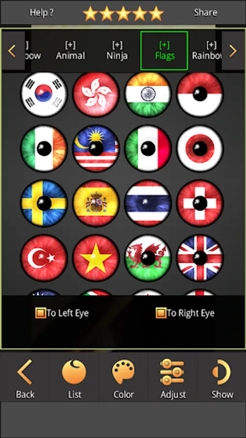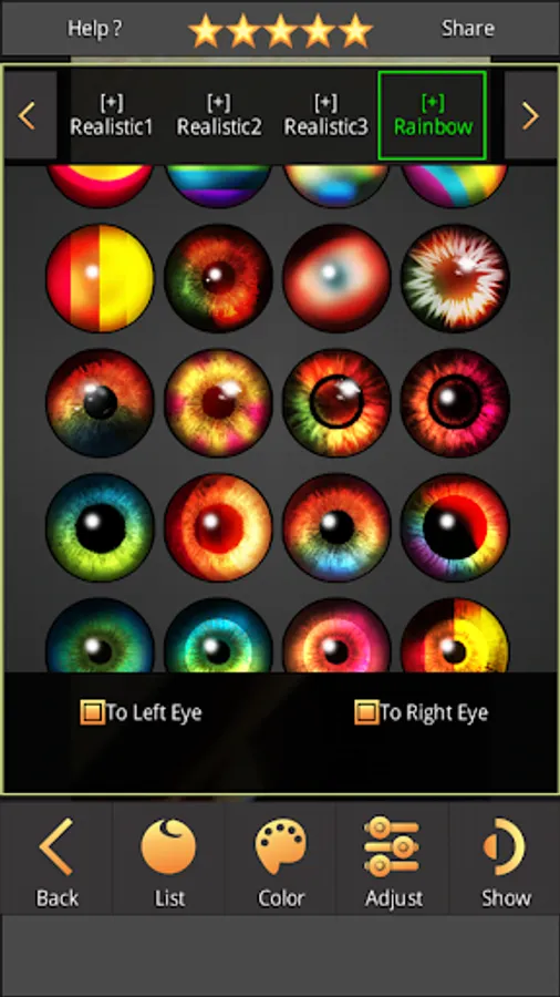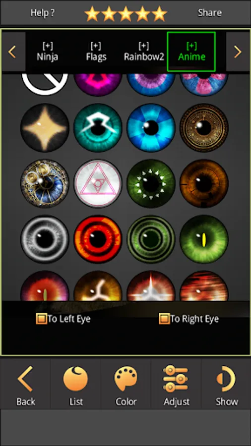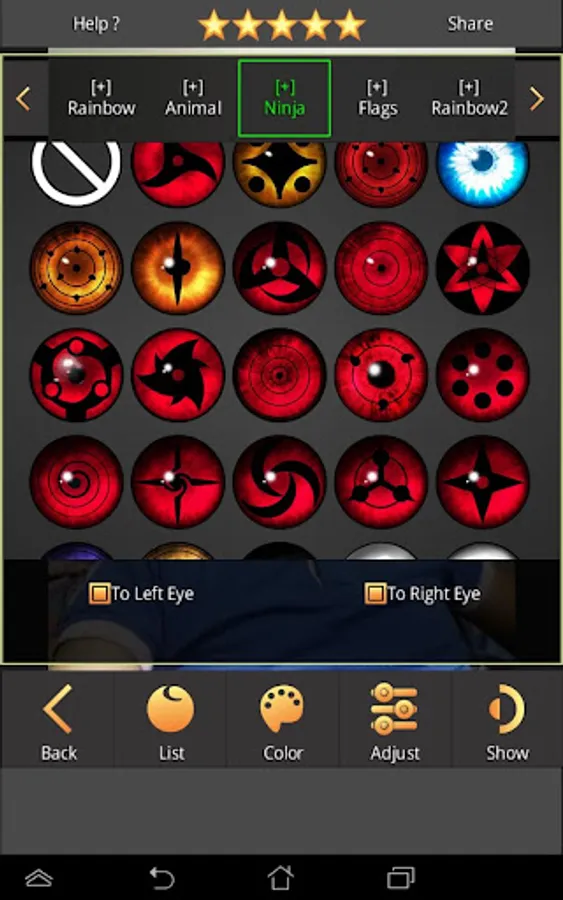 Do you want to try out rainbow eyes, anime eyes as such as Geass 's eye, Demon 's eye ...? How about adding Sharingan and Rinnegan and begin yourself shippuden ? Don't need applying makeup or lenses, you can try all of these.