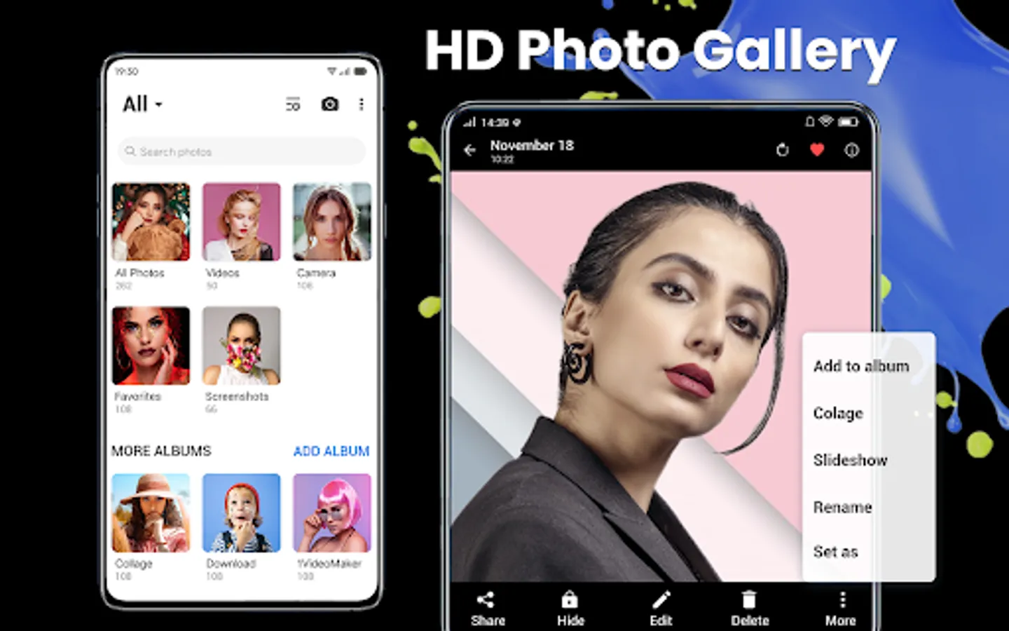 HD Gallery is a feature-rich app for organizing your photos, password-protect your photos, display photos with folders or slide-show style, edit pictures, collage photos and share the best moments via social networks. Photo Gallery Album is the best Special Gallery collections to organize pictures, GIF, videos and albums for your android smart phone. 🎊🎉
