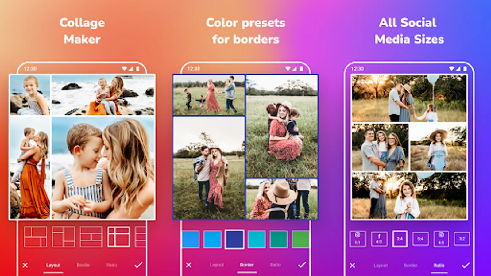 Full-features photo grid collage maker with many layouts, photo frames, backgrounds, stickers, and text fonts to create incredible photo collages!