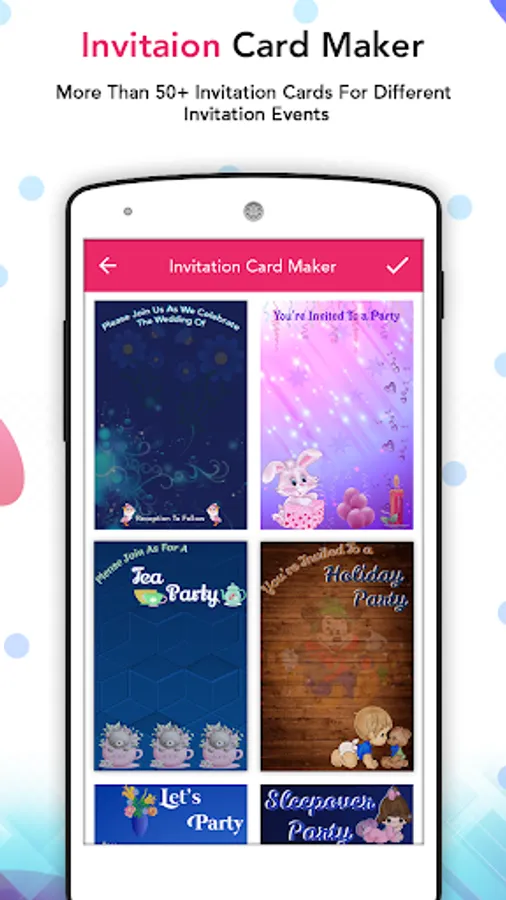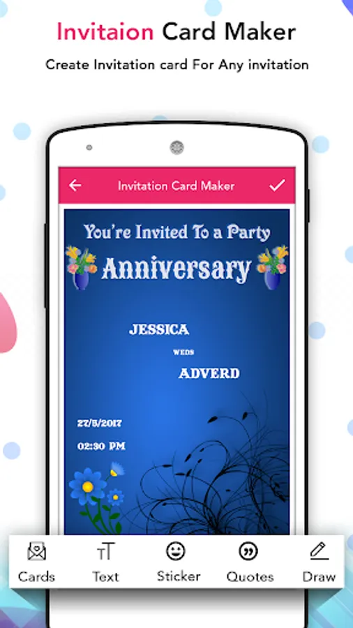 - Save your Invitation Cards and share on any social networking platform directly from the app.