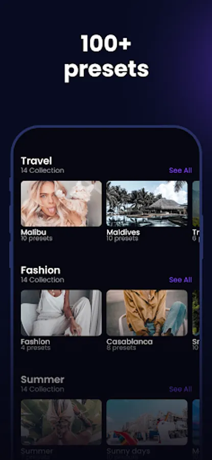 Save time. The LR Editor app will help you save time on processing photos. Preset Editor filters are extremely easy to use. Choose the filter that suits your creative work and apply it. Preset Editor filters are sorted into categories, so you can easily find Lightroom presets under specific headings like Travel, Fashion, Summer, and more.