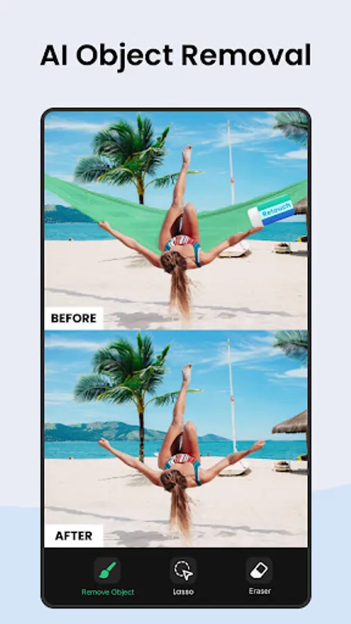 No need to find another app, Pic Retouch is your one-stop photo editor & object remover. Brush over unwanted objects and remove objects from photo effectively with one tap. Besides, eraser, before/after, redo/undo will be your ace assistant to help remove objects in the most natural way. Finally, it’s your time to show it off to the world!