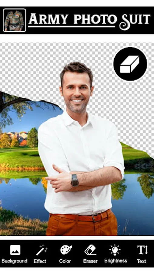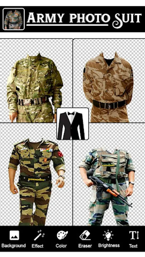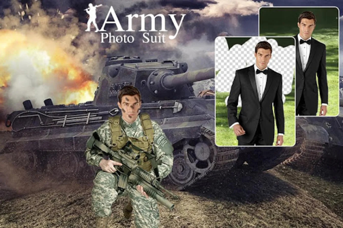 You can set your photo in any suits in army suit collection. In this app you can remove unwanted backgrounds or unwanted parts from any photo than after you can apply photo suit.