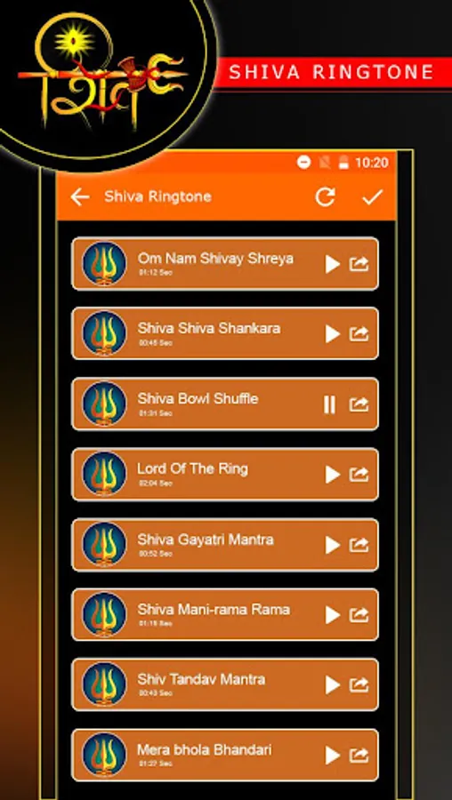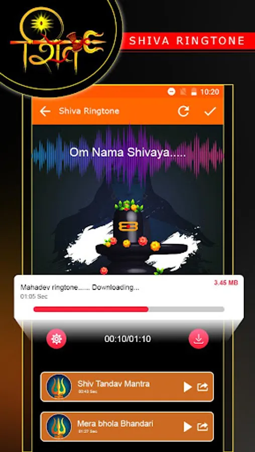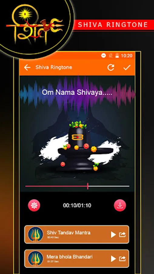 The Application Lord Shiv(Mahadev) Rigntones contains Lord Shiv Mantra, Mahadev Mantra,Shiv Dhun, Shiv Bhajan ringtones and Shiv tandav ringtones.