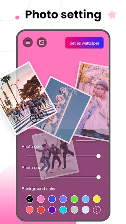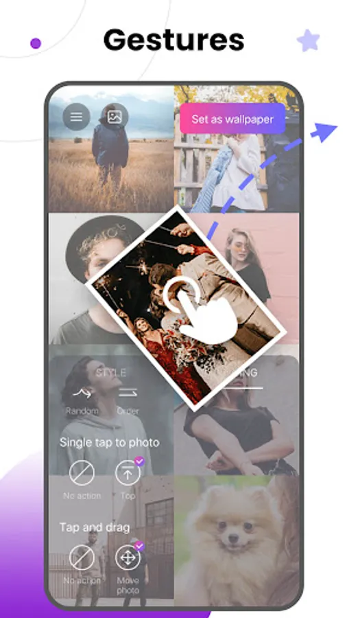 ★ Photo Live Wallpaper has multiple slideshow type to show the photos: Overlapping, Grid, Collage or Single photo.