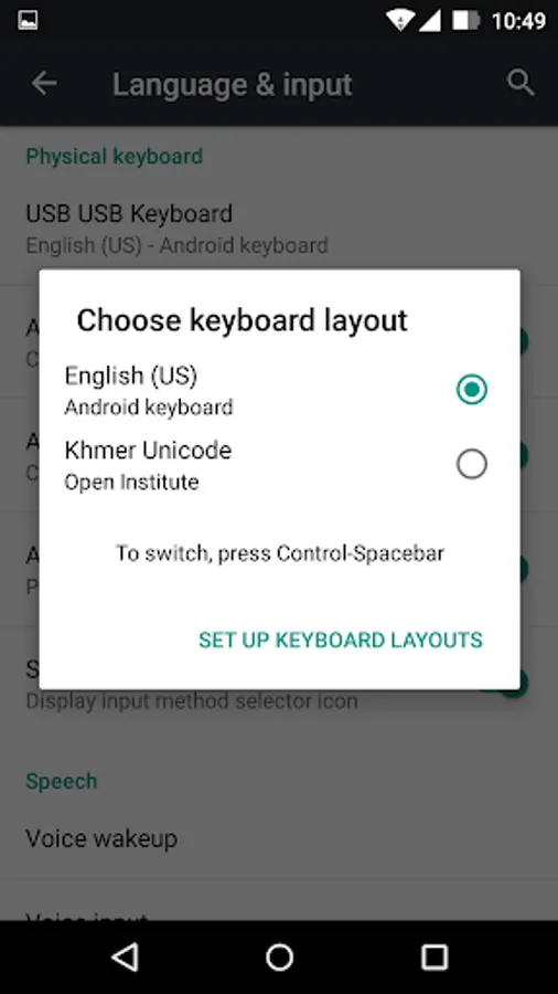 2. Add more keyboard layout by going to Language and Input in the Setting and check on Khmer Unicode(Open Institute)