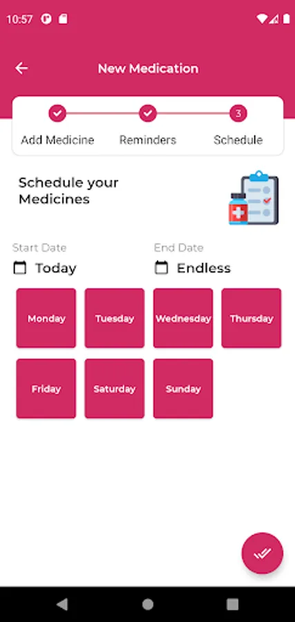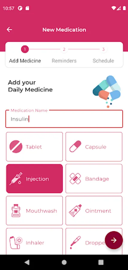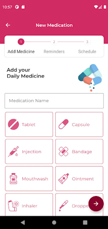 You will be able to type a pill name, enter the time slots (morning, noon, and evening), specify how many pills you take, and choose a pill icon.