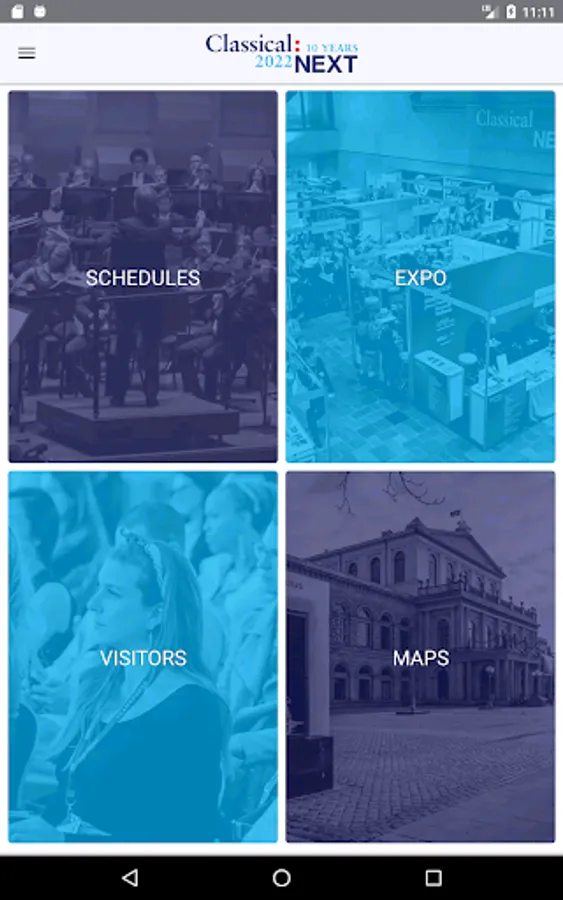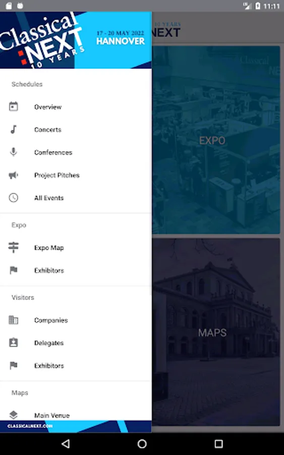 The mobile app is designed to help you facilitate networking and to find your way through the venues and the programme of Classical:NEXT 2022. It contains schedules, which can be sorted either by sections or chronologically, a list of all exhibitors, companies and delegates present at the event, as well as maps of the new venues and the new host city of Hannover.