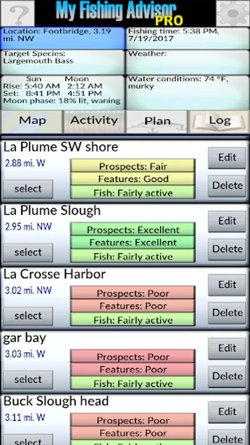 Build your own collection of fishing spots and My Fishing Advisor will help you pick which ones are most promising at a given time. It will help with lure selection, and even details like the most appropriate rods, line, hook sizes and sinker weights. Beginners use My Fishing Advisor to take the frustration out of learning to fish and to find success much faster. Experts use My Fishing Advisor to find patterns they might otherwise overlook and to find and catch fish more consistently.