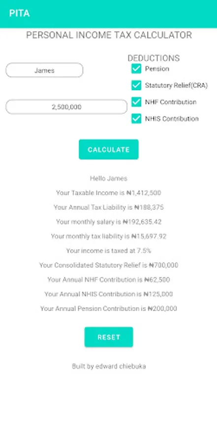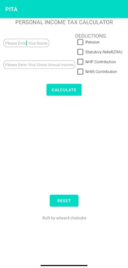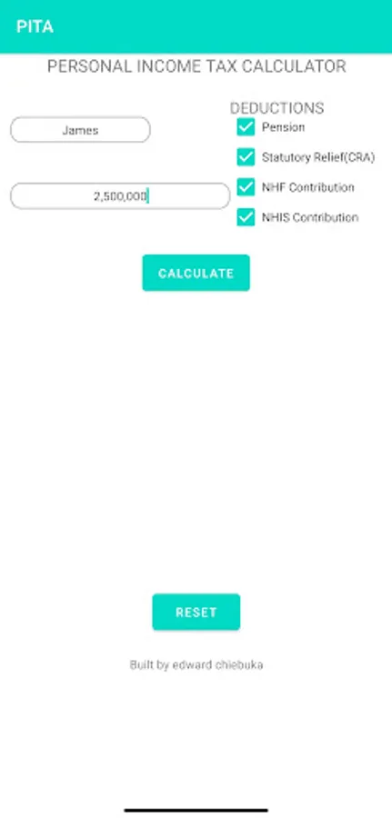 This app helps you calculate your personal income tax liability. Enter your name and annual income then select which deductibles apply to you and press the calculate button