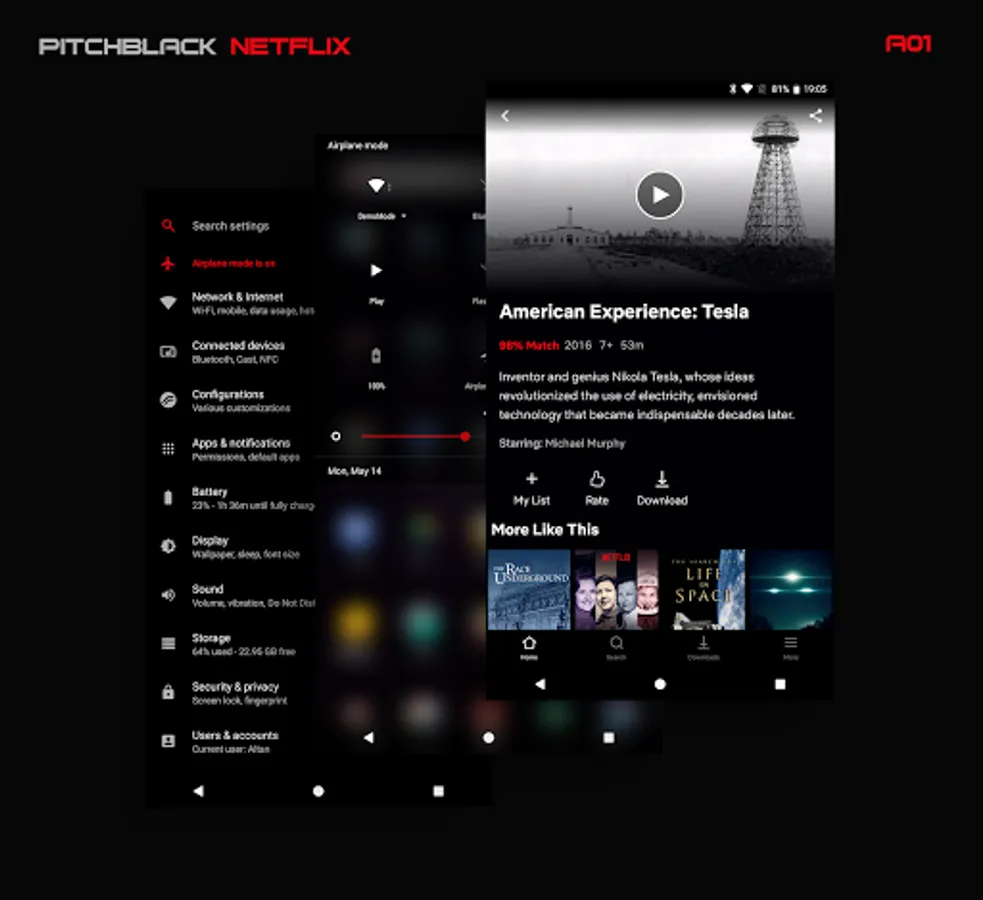 PitchBlack is a known full featured dark and black battery friendly android theme. Providing many apps and ROM support, perfecting the balance between materialism, minimalism and various color combinations.