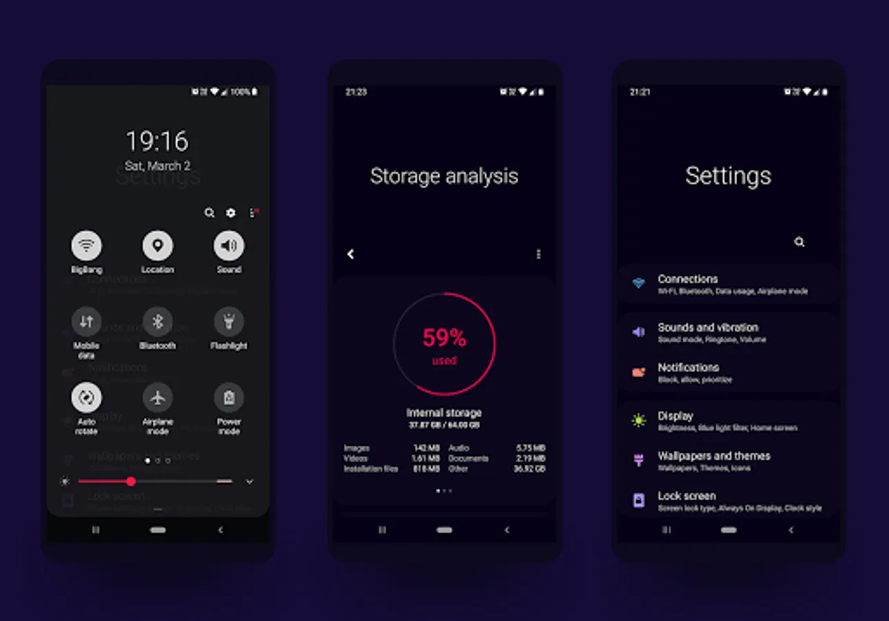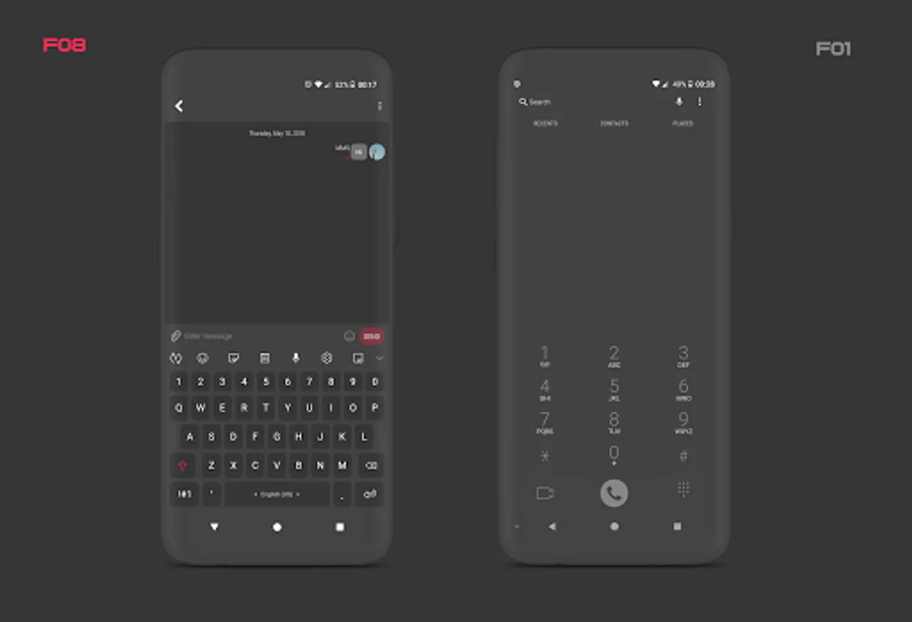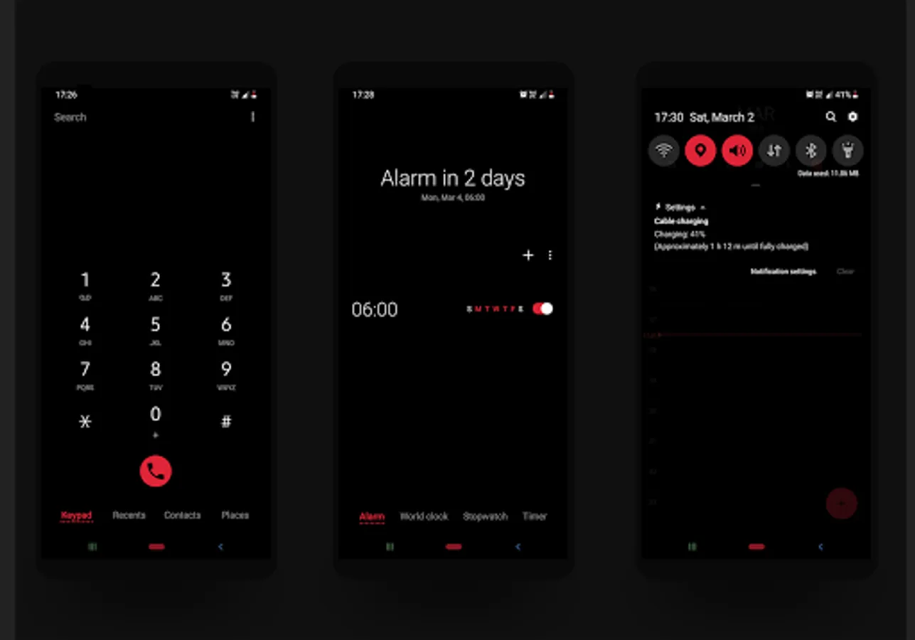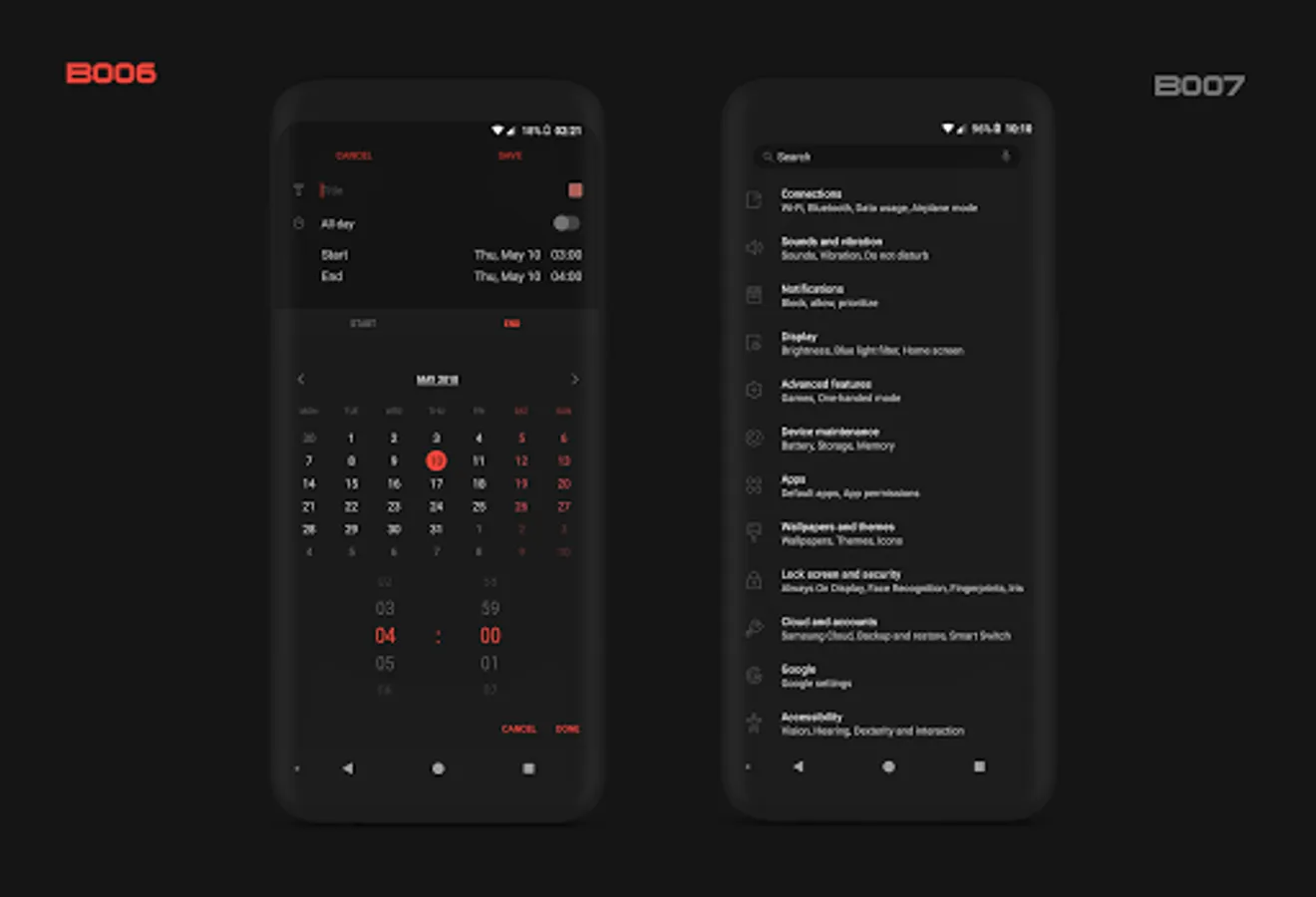 Pitch-black S is the result of perfecting the art of materialism, considering the depths of minimalism and playing around with the most vibrant color combinations. As the name of the theme suggests, “PitchBlack” is a “dark” theme that works with dark and/or black backgrounds (the users get to choose!) which makes it battery-friendly for AMOLED devices.