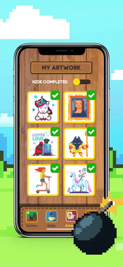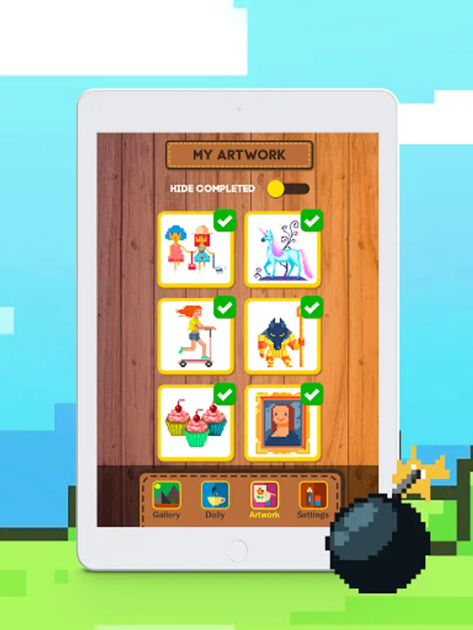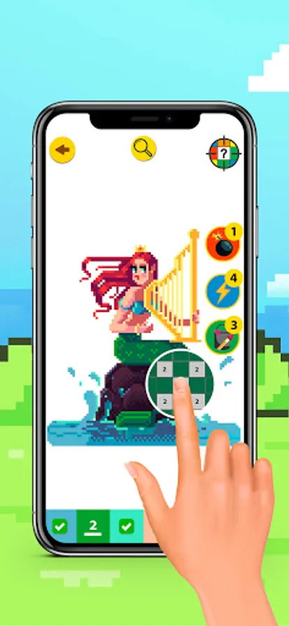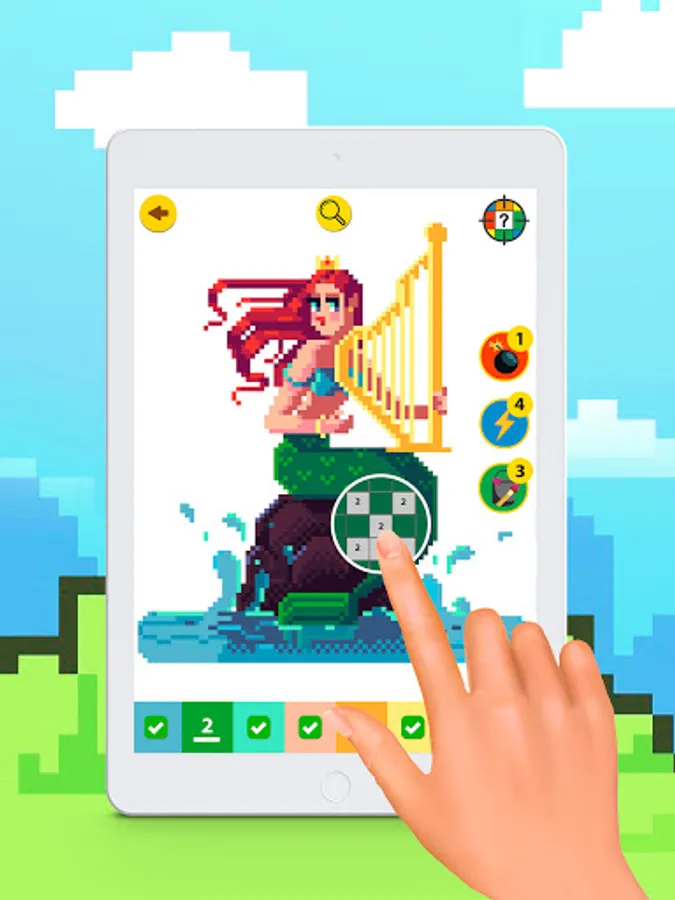 To make the process of painting by numbers more interesting, we added boosters to the coloring book. The lightning will paint over random cells in the field of view with the desired color. The bomb will paint over the area around the point you specified with the desired color. The watering can will paint over all the neighboring cells of the coloring book with one color.
