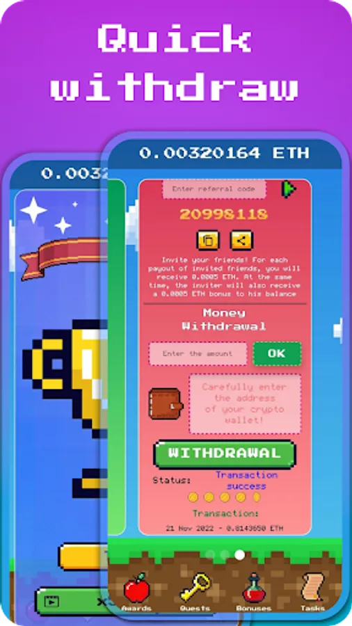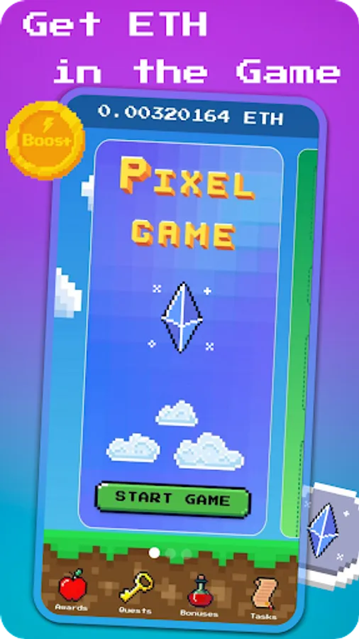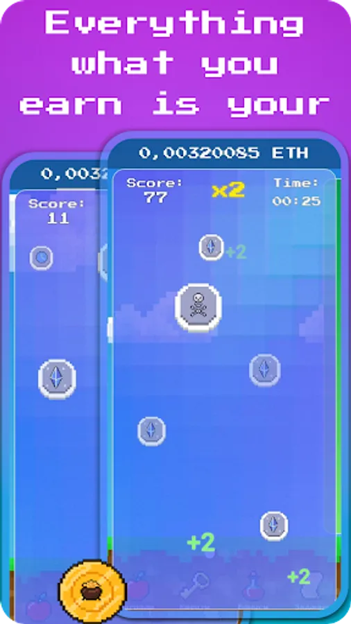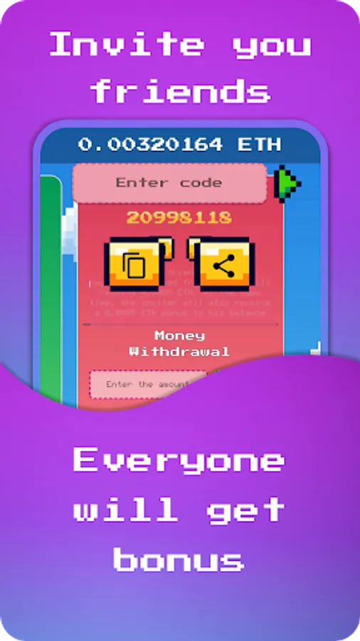 Ethereum game is a crypto game with Ether accrual, it allows users to plunge into the vast scope of the crypto industry and purchase their well-deserved prizes, adhering to clear conditions. Everyone will be able to enjoy the game and get a new experience in the accumulation of Ethereum. The superbly rendered 8-bit style interface will appeal to many users and will help to achieve high results in the shortest possible time. Also, for inviting friends to the game, it is possible to earn even more bonuses.