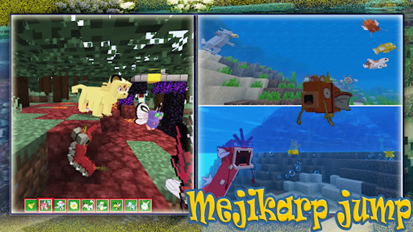 Hello, friends! Install our new Pixelmon addons for Minecraft games and welcome to the Pokemon universe, where cute, kind and not so kind special creatures - Pokemon, as well as various items and game mechanics are added. Would you like to try yourself as a legendary pokemon trainer? If you download Pixelmon craft go poke battle for Minecraft, you will have a wonderful opportunity to catch them all, tame and collect a Pokimon with supernatural abilities and close your Pokedex or become a cool Pokemon Master, developing them, making pokemon duel and pokemon go battle, and completing pokemon quests. It is also possible to create pokemon evolution. In this catcher app, you will meet Bulbasaur, Mewtwo, Eevee and others who have already fallen in love with everyone. For novice trainers, an excellent choice would be the calm and kind pakimon Pikachu, which, at will, can produce an electric charge of various strengths and more. Befriend this picachu in Pikachu Game as you explore the Pokemon world in Minecraft and build a powerful team of Pixelmons. Catch pixelmons using pokeballs. Find and tame the Squirtle who can perform water attacks. Obtain a Charmander in pokemon battle. This cute fire-type Pixel mon can make fire attacks of various strengths, exhale fire from its mouth, and also attack with its claws. The level of flame at the tip of the tail indicates emotion and vitality. Learn Medjikarp jump. Encounter the aggressive and obnoxious Gyarados, leaping long distances from both water and land. Try to tame it and may the power of the Pokémon Master be with you! Intrigued? Then download our Pokemon Minecraft games mod and tame all kinds of pixel pokemons! Pokémon! I choose you! Step by step, choose an attack, revealing the true potential of your Pokémo in pokemon battle games and boldly go forward to victory with Pixelmon mobs for Minecraft pe 2023!