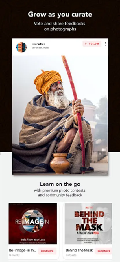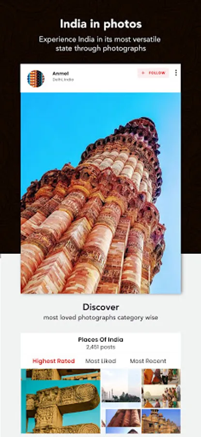 Enjoy a fresh & high-quality feed of photographs from India every day. With one click, set your favourite photos as the wallpaper on your smartphone. Various facets of India captured in a visually stunning way - an experience like never before. Read stories, connect and engage with Indian photographers who are creating a visual repository of the country.