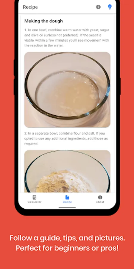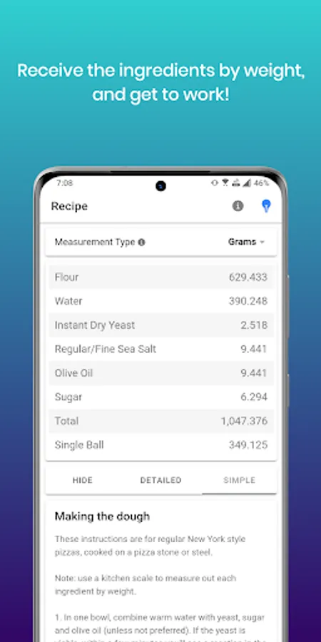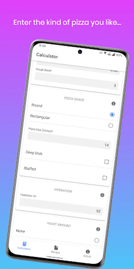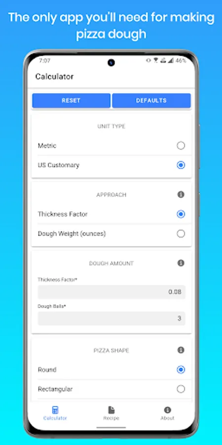 This app takes values like thickness, number, size, weight, additional ingredients, etc, and provides values (by weight) you can use to make pizza dough. This app intends to help bridge the gap between the well-known Pizza Dough Calculator (or Dough Tools) and newcomers to make it more accessible. As such, this app contains: