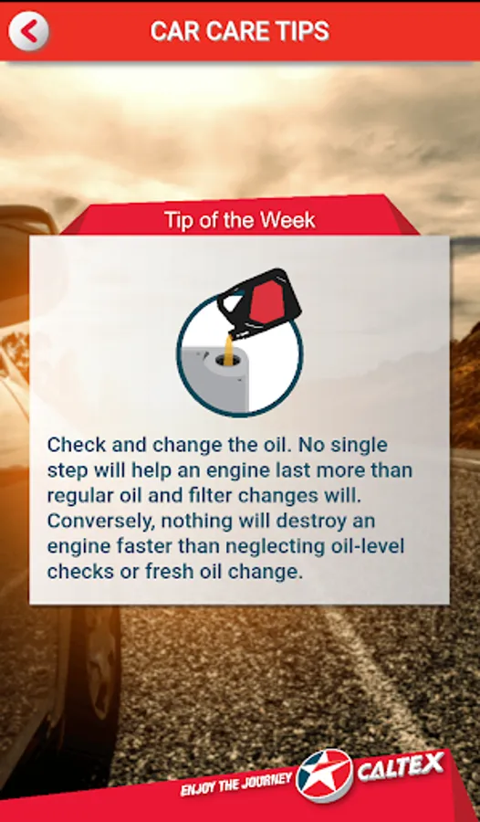 The Caltex Mobile app features locations of our distributor & oil change stops, an easy Maintenance Reminder, Engine Lube Checker, Car tips and a products portfolio of our vast array of oil products