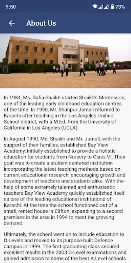 Ms. Safia Shaikh and Mr. Shahpur Jamall established Bay View Academy in 1990. Ms. Shaikh was at the time running Shaikh’s Montessori, a very highly regarded Montessori school established in 1984. Mr. Jamall returned to Karachi with an M.Ed. in Education from UCLA in 1989.