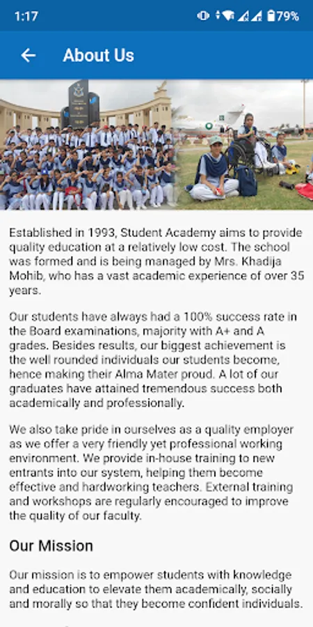 Student Academy established in 1993, Student Academy aims to provide quality education at a relatively low cost. The school was formed and is being managed by Mrs. Khadija Mohib, who has a vast academic experience of over 35 years.