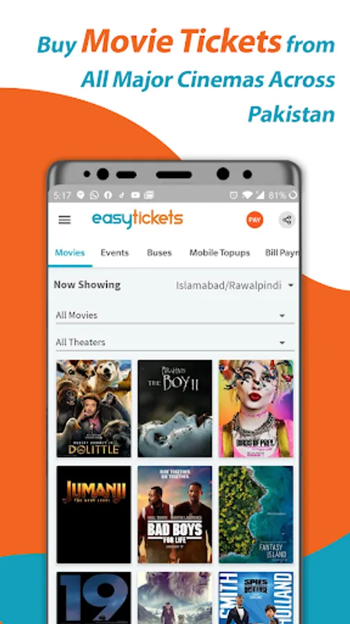 • Multiple payment options to buy movie tickets including Bank Transfer, Credit Card, Debit Card, all mobile wallets (Omni, EasyPay, JazzCash and SimSIm), all Cash agents (Omni, EasyPay, JazzCash), HBL bank account payments.