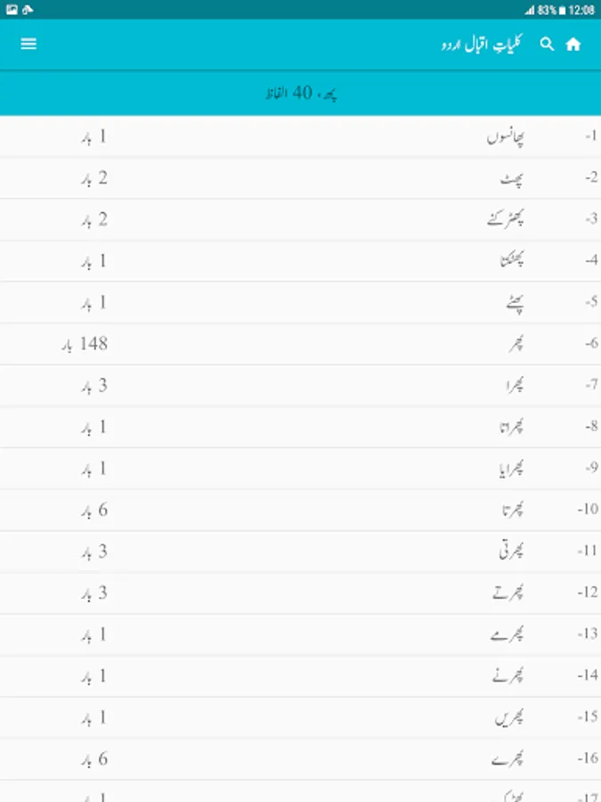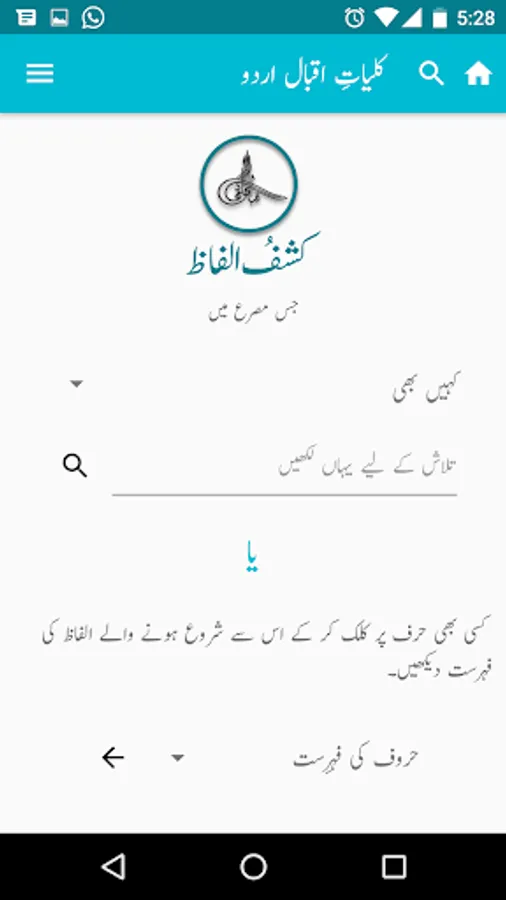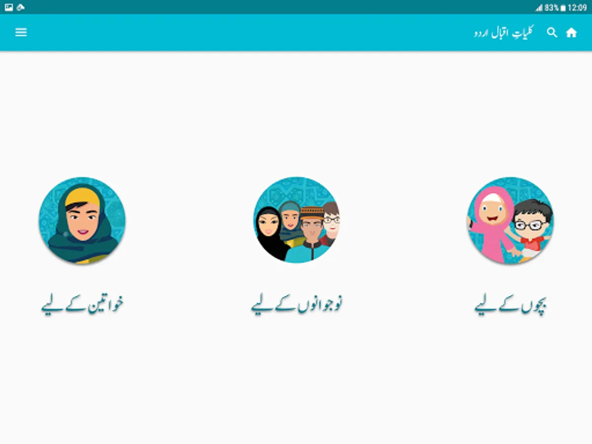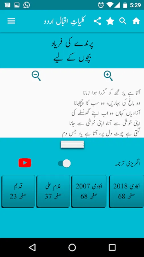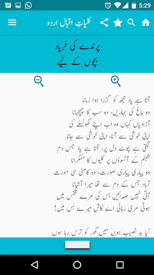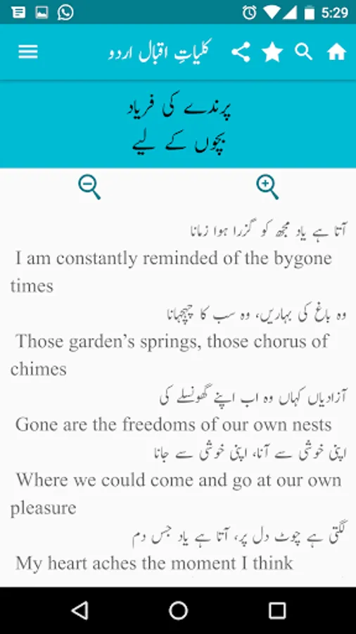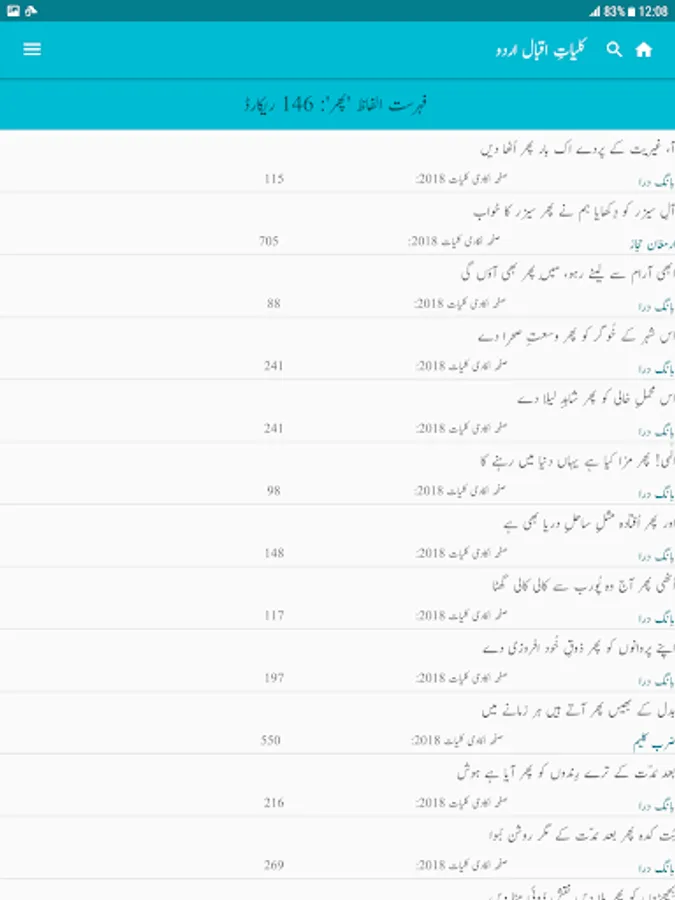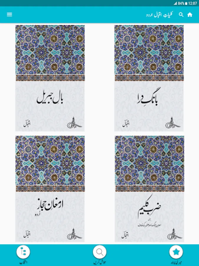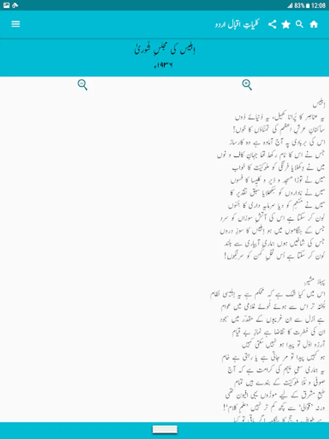 A user can browse offline definitive text of his complete Urdu poetry i.e. Bang-e-Dara, Bal-e-Jibreel, Zarb-e-Kaleem and Arumghan-e-Hijaz (Urdu) in Nastalique script. By selecting English Translation option, one can also read, copy and share authentic English of entire Urdu works. In addition to search in text bar, a user can also select any word alphabetically from his poetry. The search results show all the verses containing text from search bar or the selected word. These searched verses provide gateway to entire poem, Ghazal, Satirical or the Quatrain as the case may be. One can read, mark and save his favourites and share it by email or social media.