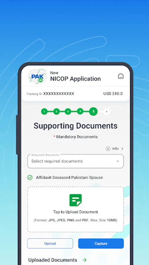 • Document upload through both mobile cameras and by uploading files