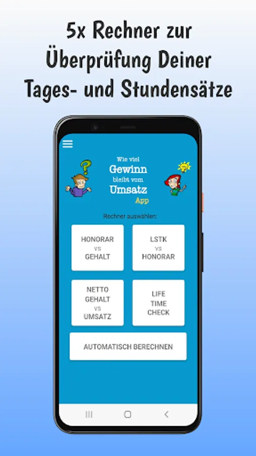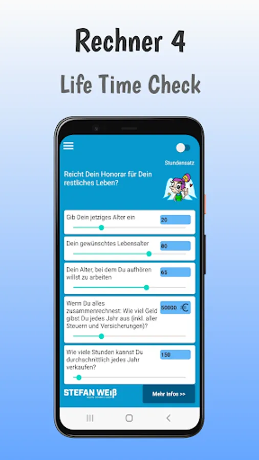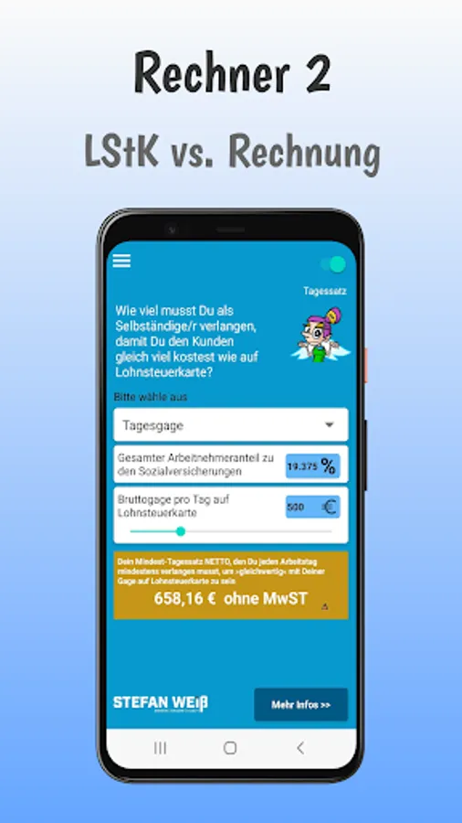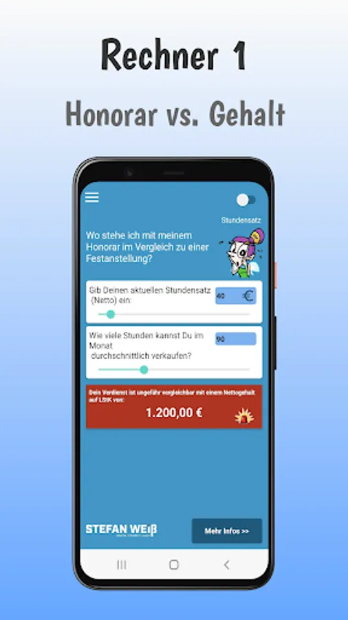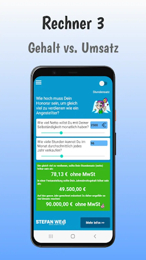 Use the app to quickly and easily check whether your daily and hourly rate fees are sufficient and crisis-proof for your self-employment - or whether you may need to make improvements!