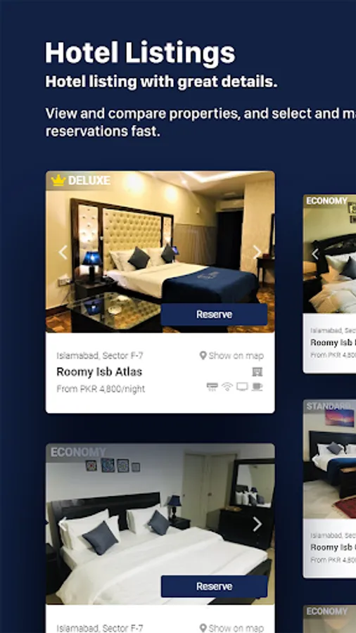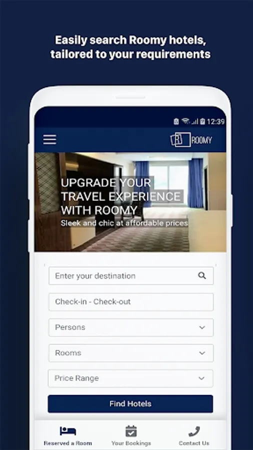 The Roomy booking app lets you book rooms and manage your stay from the tips of your fingers. With real time availability and pricing information; location, rates, amenities and travelling dates based search filters; online payments and check-ins, and absolutely free download and use, the app lets you compare and select properties according to your budget and needs, and make reservations fast in a few simple steps,.