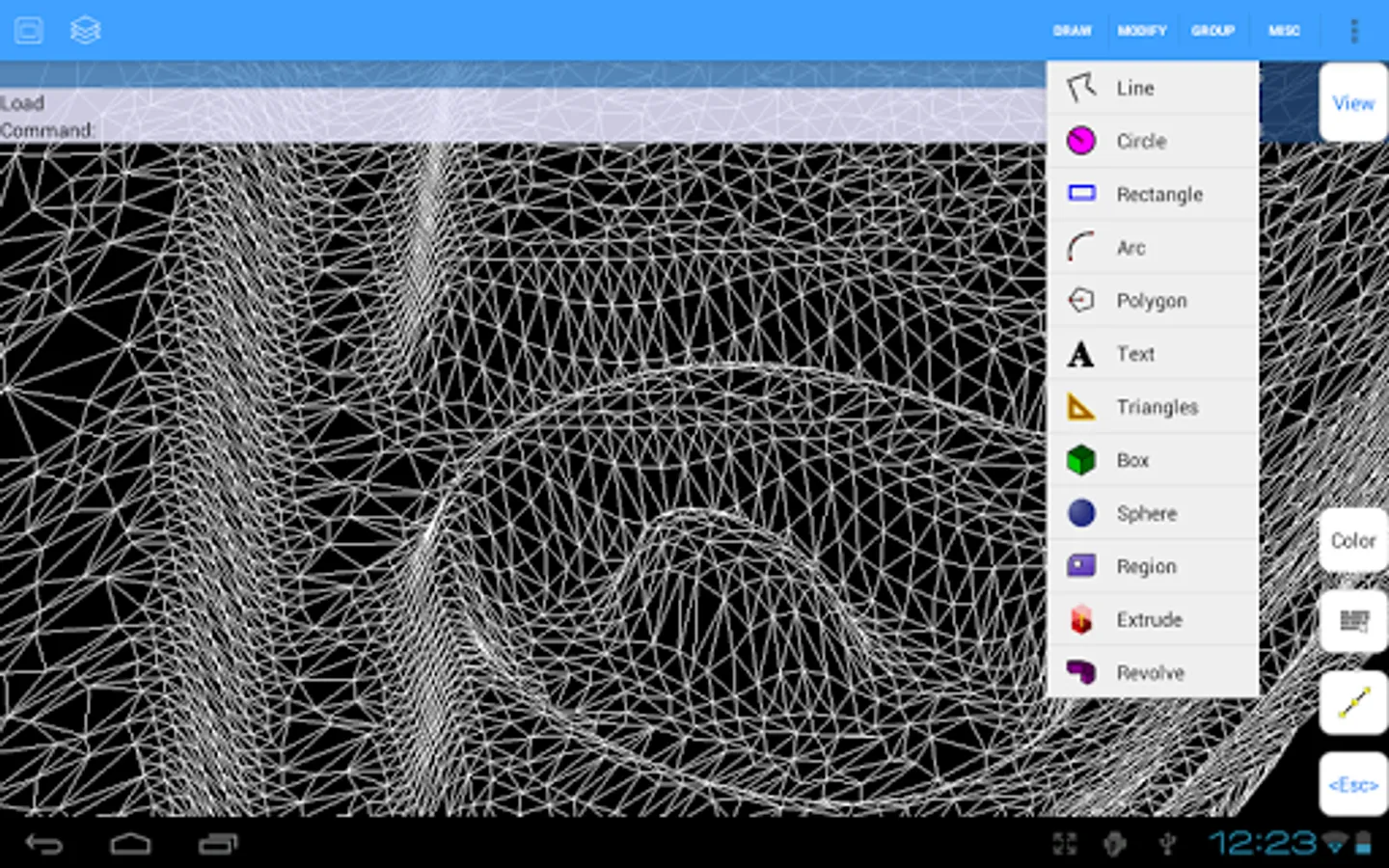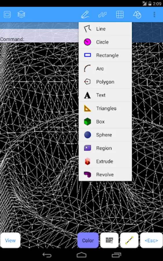 ・Tools: line, circle, rectangle, arc, polygon, text, triangles, box, sphere, region, extrude, revolve.
