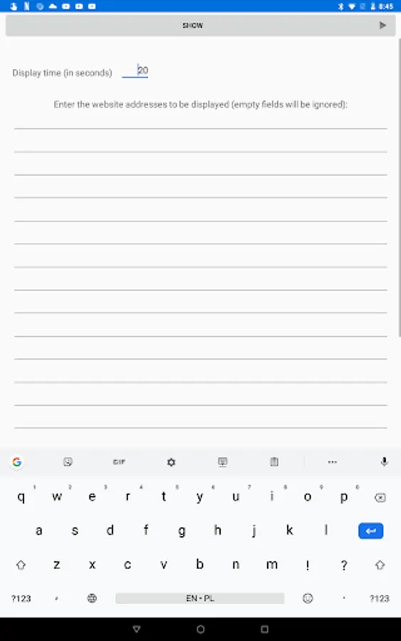 The application allows displaying websites in a loop. The user can enter up to 20 pages and set the display time in seconds.