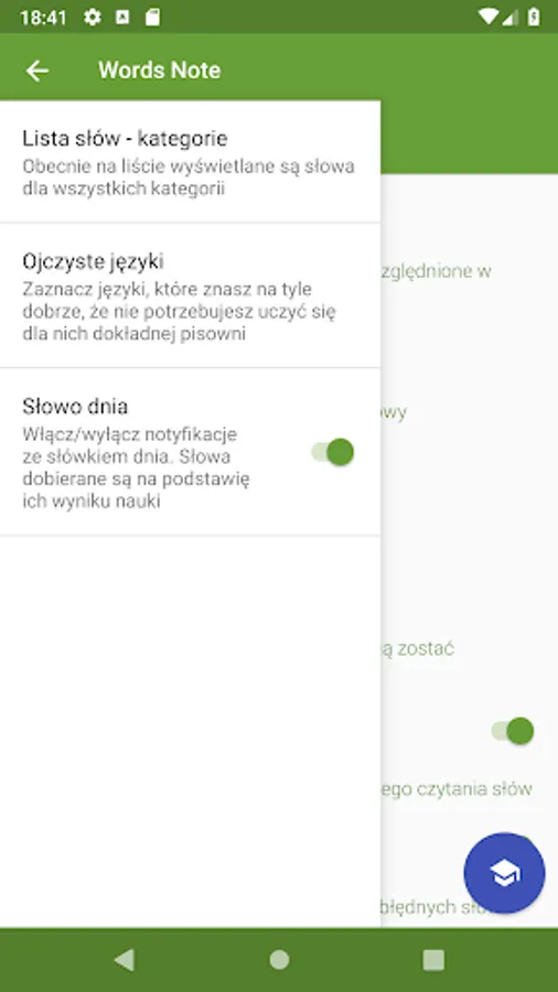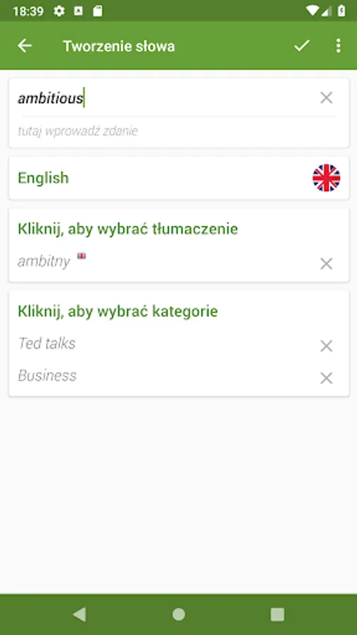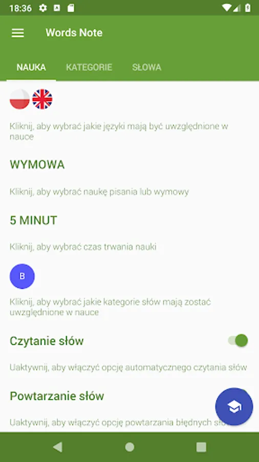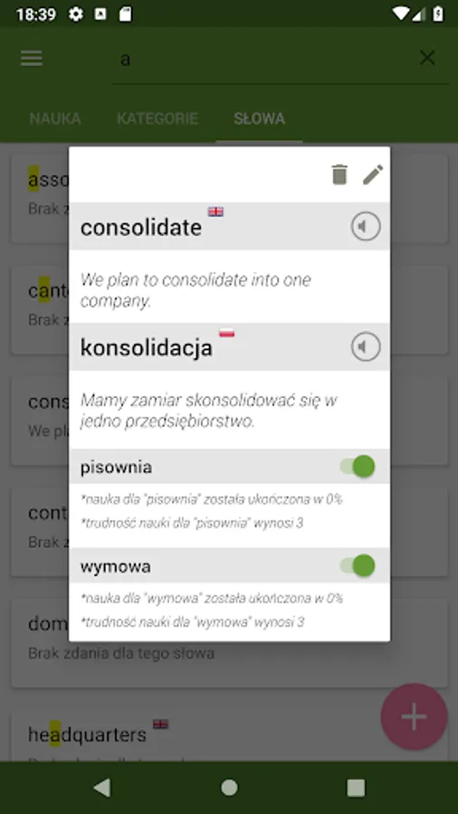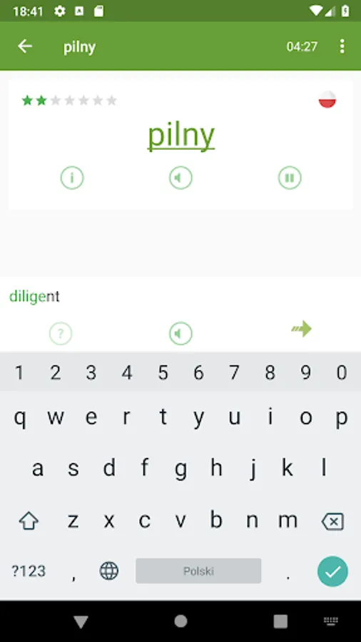 Second uses google speech recognizer service. It checks your pronunciation, although the quality of the recognizer strongly depends on your hardware and Android version on your device, you can test yourself for the majority of words. You have to know that this mode of learning requires the internet connection. You can always disable words that you already know, so you don't have to learn it more.