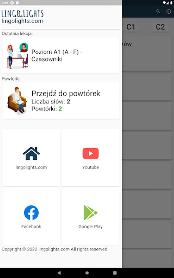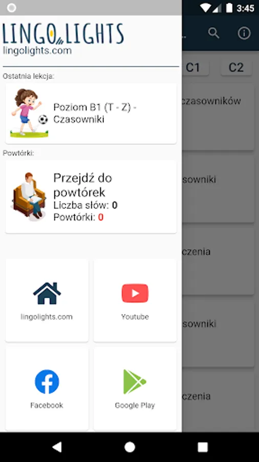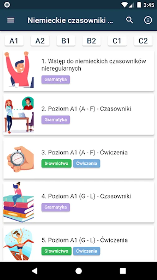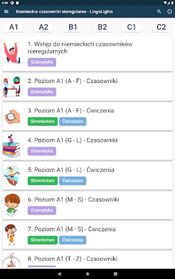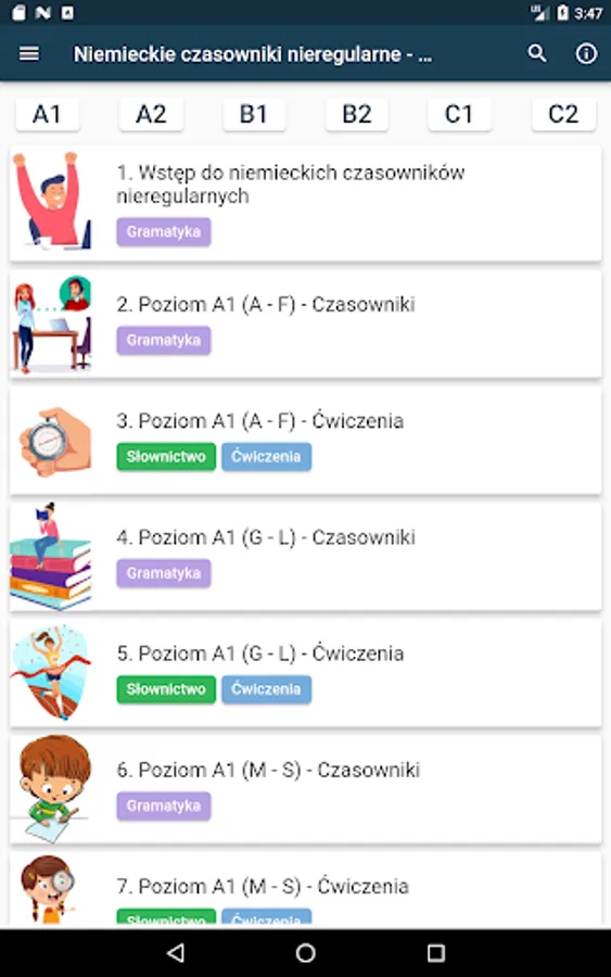 in this app you will find more than 200 irregular German verbs with translation, audio pronunciation and forms in Präsens, Imperfekt and Perfekt and an auxiliary verb for the tense Perfect. The application contains over 600 sample sentences with translation into Polish - you will see the use of each verb on the example of sentences in three different times. The study material is divided into 56 sections, which correspond to the various levels of language proficiency. These verbs are divided into levels (A1 to C2). The division of verbs at levels A1, A2, B1 meets the requirements of the Goethe Institute. Verbs on the B2, C1, C2 levels have been divided according to own rich experience. German irregular verbs is an Application for all levels of language proficiency.