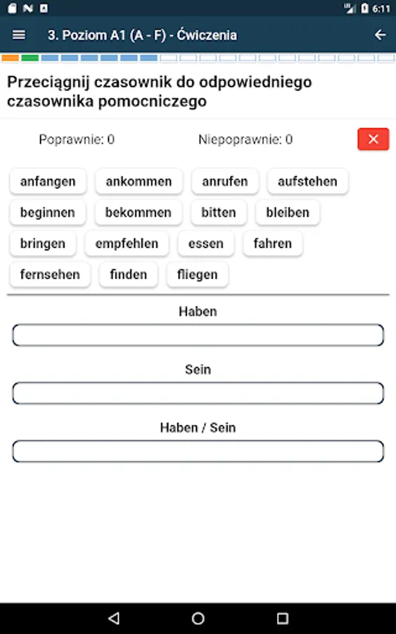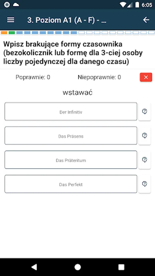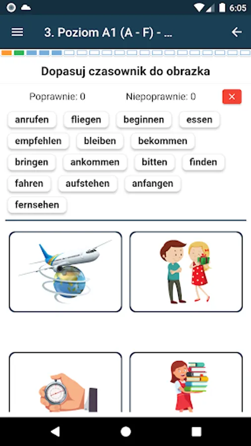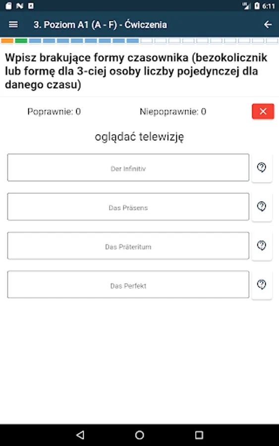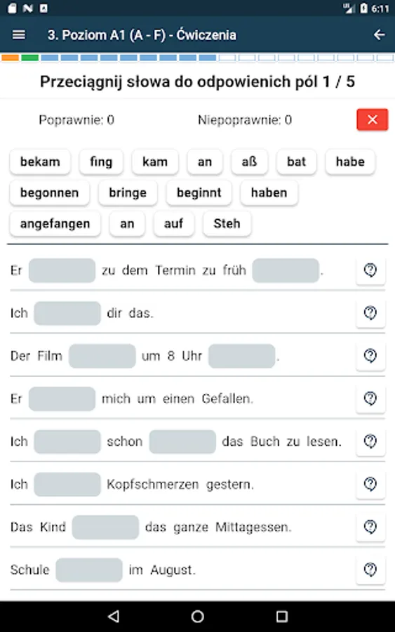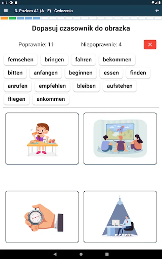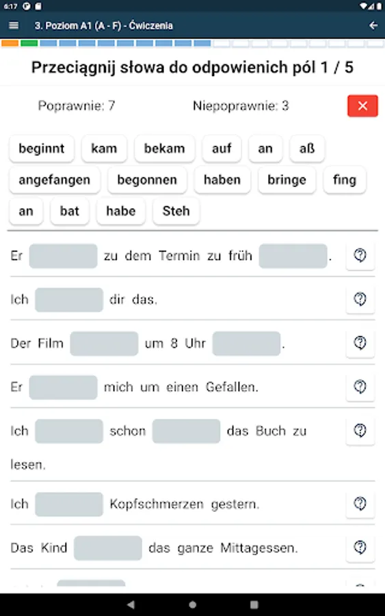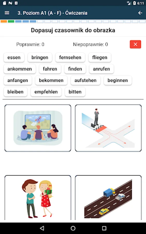 - various types of exercises: filling empty spaces with correct verbs, creating the appropriate verb form, selecting the appropriate auxiliary verb, verbal scum, translating the meaning of a verb from Polish into German, translating the meaning of a verb from German into Polish, quizzes, dictations,