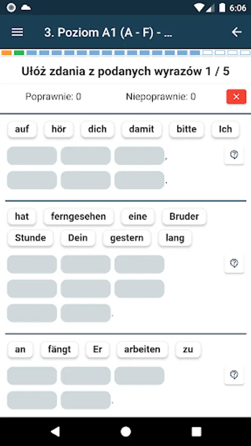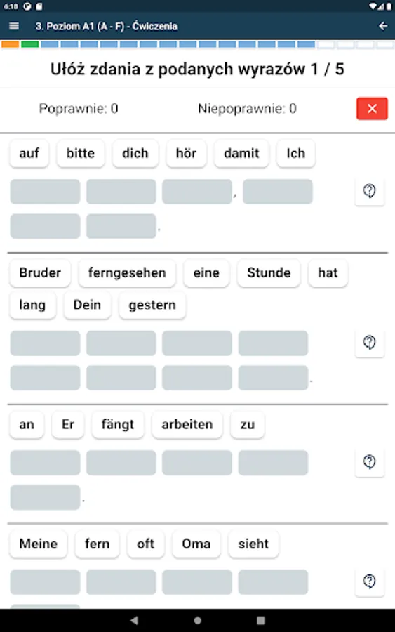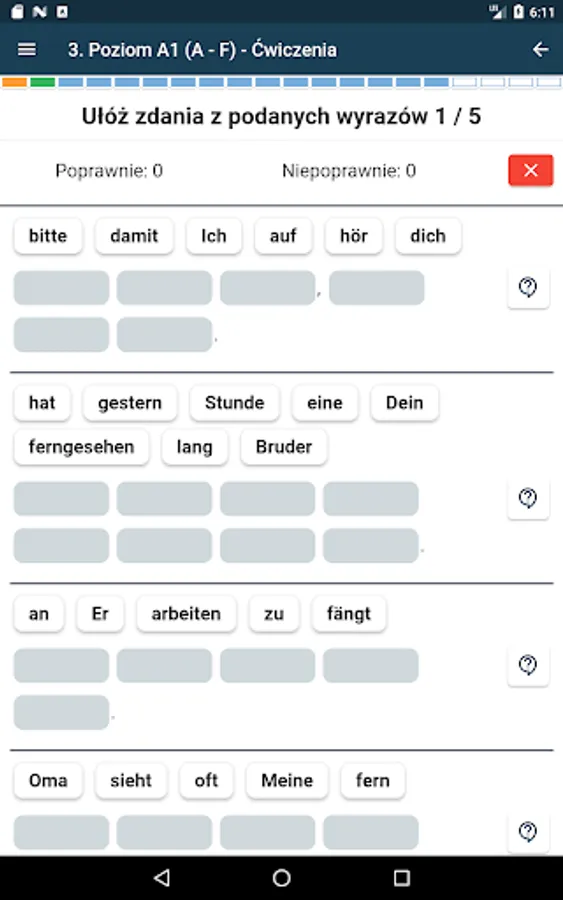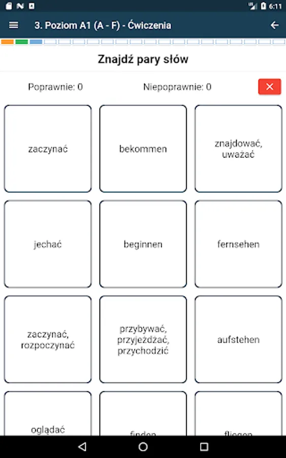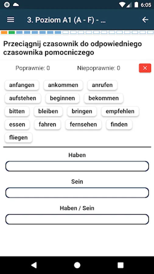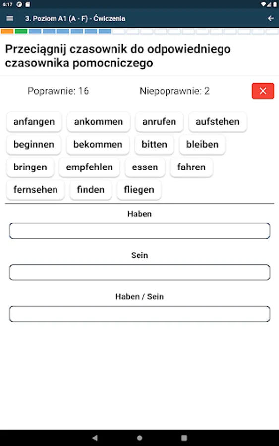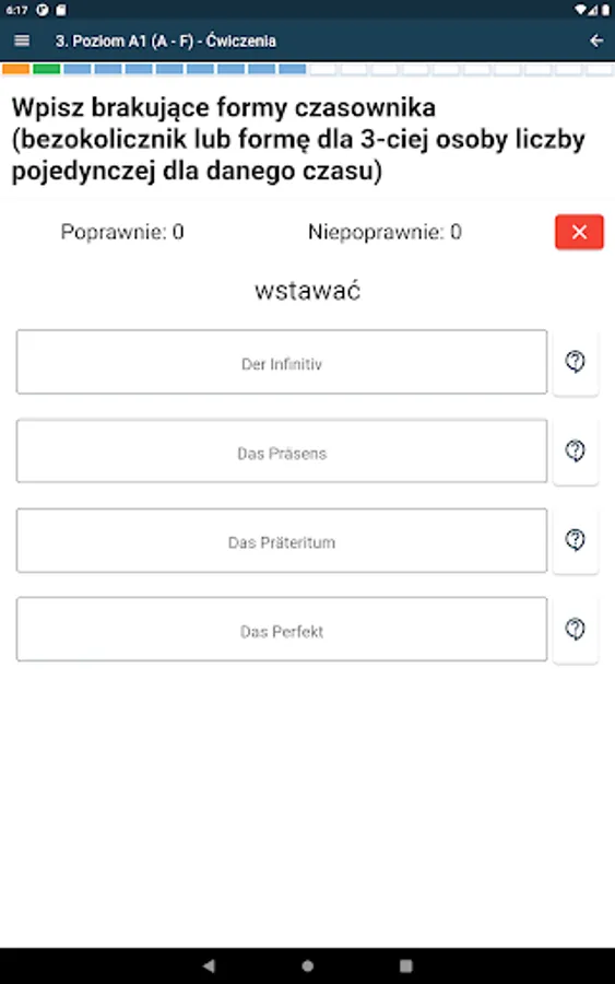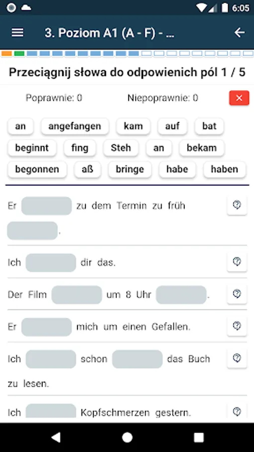 - various types of exercises: filling empty spaces with correct verbs, creating the appropriate verb form, selecting the appropriate auxiliary verb, verbal scum, translating the meaning of a verb from Polish into German, translating the meaning of a verb from German into Polish, quizzes, dictations,