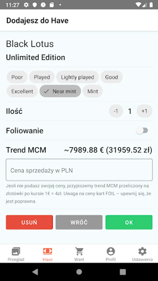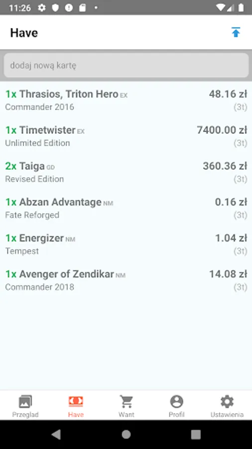 This is the initial version of the application. I would like to plan further functionalities, eg PUSH notifications about the appearance of cards with Have / Wants, advanced search and filtering of cards, chat between users, an assistant in the valuation of cards during face-to-face deals and many more.