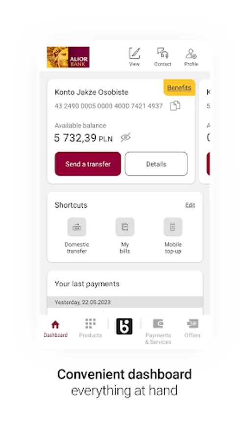 Alior Mobile means safe, fast and convenient access to your bank account anywhere, around the clock. Install the application and manage your products, make transfers to a bank account or phone number, make mobile payments in stationary stores and online, and take advantage of personalized offers. If you do not have an account yet, create one via the application using VideoSelfie.