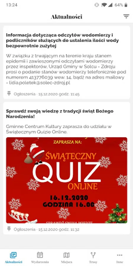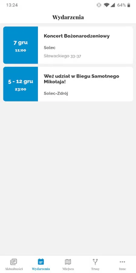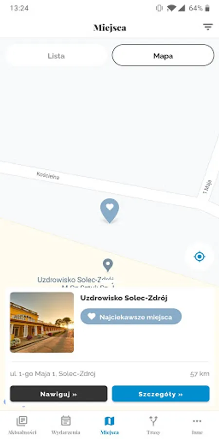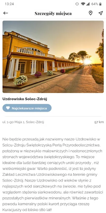 The application is a practical tool for modern tourists, patients and residents, allowing them to navigate the tourist routes of the Solec-Zdrój Commune and giving access to a rich database of information about the most interesting places located in their vicinity. The mobile application allows you to view all walking and cycling routes in the commune on the map. Each route has assigned facilities, including interesting sightseeing, cultural, natural and historical sites. The application also contains a lot of information on current events (parties, cultural events, concerts), information for residents, information about the region. We will also find a presentation of the most interesting places, accommodation and gastronomy. Via the phone, you can follow the offer of events organized in the commune. The application will be useful for both visitors and residents. It will lead you to monuments, restaurants, hotels, guesthouses, private accommodation, and will also allow you to get to know the local architecture. The application allows not only to navigate the selected trail, but also the option of indicating directions to the selected point and searching for nearby interesting places.