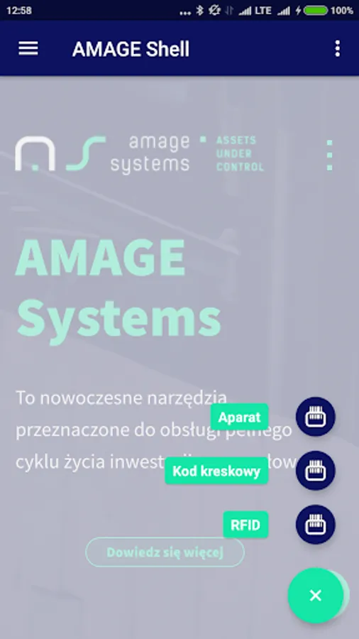 The AMAGE Shell application is a component that facilitates the use of the AMAGE system application. It allows quick access to interfaces on your device, such as a code scanner, RFID reader, and a camera. The close connection to other AMAGE applications simplifies and accelerates the use of many functions.