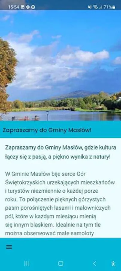 The Masłów commune is located in the Świętokrzyskie Voivodeship, north-east of Kielce. An incentive to visit this area is primarily the vicinity of the Świętokrzyskie Mountains and the picturesque location among forested hills and endless fields. The "Masłów" mobile application is both a guide for tourists and a useful information tool for residents. Masłów's motto - "community with flair" clearly indicates the dynamic development of the area and a lot of opportunities to spend free time.
