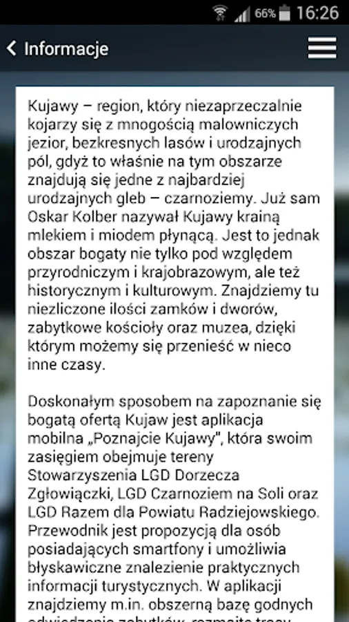 An excellent way to learn about a wide range of mobile application is Kujaw "Meet Kujawa," which includes the areas of its range Basin Association Zgłowiączki LAG, LAG humus on Salt and LGD Total for District Radziejowski. The guide is a proposal for those with smart phones and enables you to instantly find practical tourist information. In the application, we find, among others, extensive database of historical sites worth visiting, various hiking and major events in the region. The application is updated on a regular basis, so that everything can be kept.