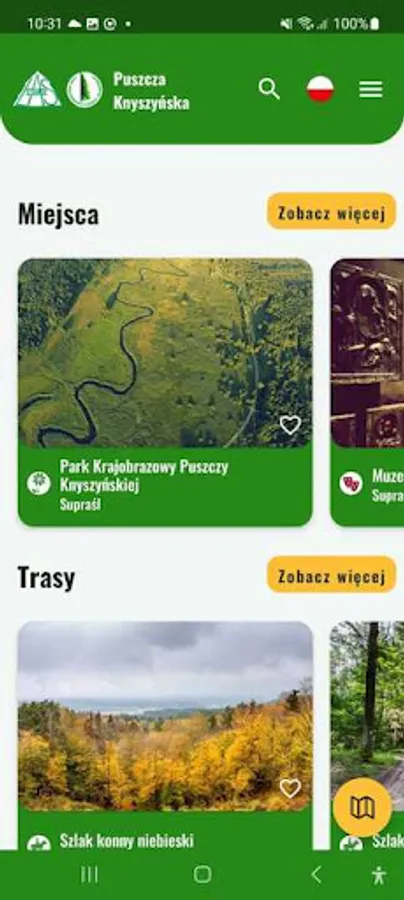 The mobile guide Puszcza Knyszyńska contains a number of modules that help users discover the most charming corners of the forest complex. Thanks to the clear interface, all information is easy to find. The application includes a database of objects divided into categories and a number of routes that are ready-made suggestions for spending time. The event module, in turn, informs about current events, additionally diversifying your stay in the vicinity of the Knyszyn Forest. A great convenience for users is the planner, to which you can add the most interesting objects, routes and events, thanks to which they will always be at hand. A large database of forest curiosities has been included in the encyclopedia - the descriptions of plants and animals in it have been enriched with photos, which is a real attraction especially for younger users.