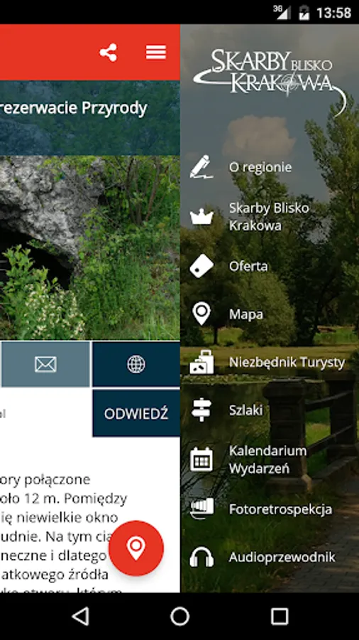 "Treasures of close to Kraków" is a mobile guide the tourist attractions around Krakow four municipalities: Chernihiv, Mogilany, Skawina and Upper Świątniki. The most beautiful churches, mansions, museums, nature reserves and other interesting places of the region are described in detail just as the "treasures" that remain often in the shadow of Royal City, yet worth mining and admire. Their tour was offered in twelve key thematic routes. Individual trails dictate where we find the greatest attractions of religious, natural or otherwise, such as the most beautiful vantage points. For those who prefer an active way of spending time, offers thirty-bike trails, hiking and horse riding.