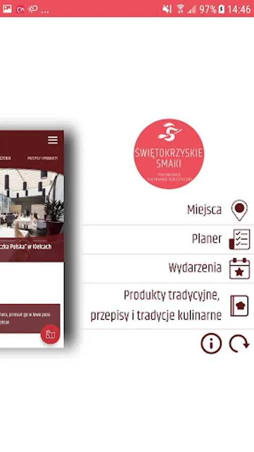 The "Świętokrzyskie Smaki" application is primarily a culinary journey of picturesque parts of the Świętokrzyskie Province. Together with the mobile guide, we can visit the most interesting places in the area: we can find here monuments, culinary objects and entertainment places, where you can spend time pleasantly, while at the same time getting acquainted with the cultural heritage. Tourists and hotels and agritourism will probably be useful for tourists, where you can not only relax after the trip, but also get acquainted with local, traditional flavors.
