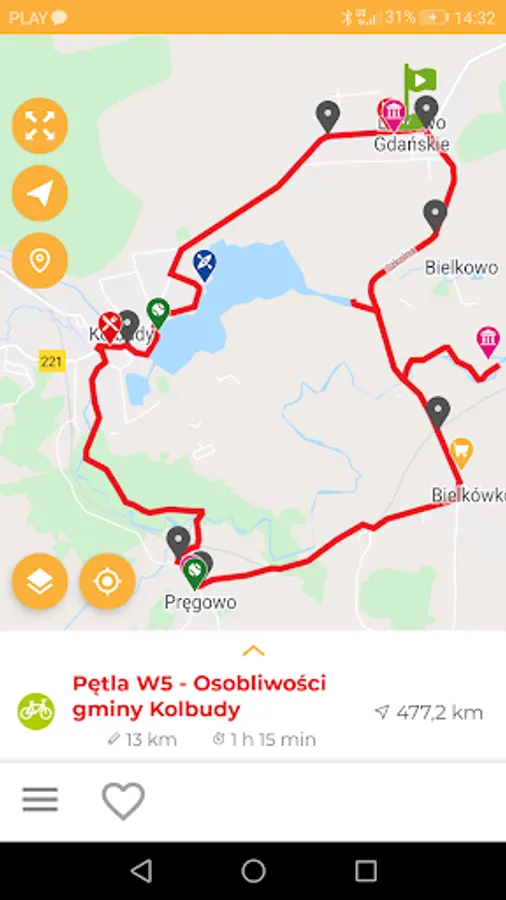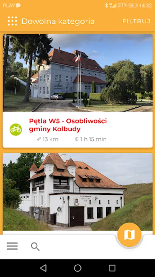 The mobile guide has a suggestion of bicycle loops that are located in the area. A clear map indicates the network of these routes and locates the route in a given area. The loops contain a description and photo, the length of the route and its travel time. The application also allows you to show all objects on the loop and filter them by selected categories. Nodal points allow you to plan one or several routes and return to the place of departure.