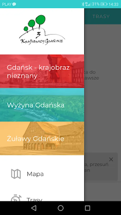 The tourist application "3 Gdańsk Landscapes" was created for a large number of tourists and guests visiting Gdańsk and the Tri-City. It would be a great damage for a tourist that, being in this beautiful city, he would not get to know the adjacent areas, closely related to this city, historically associated with beautiful landscapes and unique monuments. It is located in the Vistula Delta of the Gdańsk Żuławy with a unique unknown and fascinating history, and the charming landscape of the Gdańsk Highlands.
