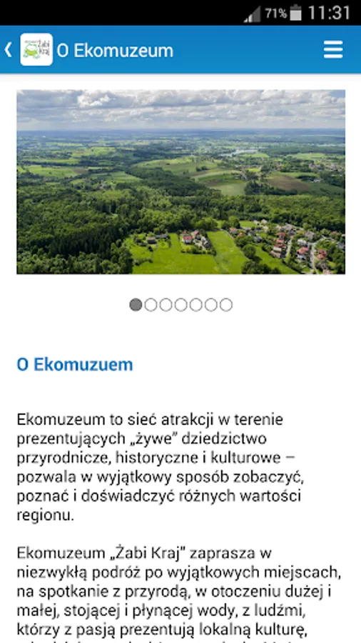 Mobile Application Eco-museum "Frog Country" makes it easier to learn a "living" natural heritage, cultural and historic Frog Country, which covers seven municipalities belonging to the Association of Local Fisheries Group "Frog Country": Chybie, Dębowiec, Stream, Skoczów, Zebrzydowices (district of Cieszyn ), Goczałkowice-Zdroj and Pawlowice (District pszczyński). The area covered by the action of LGR since the fifteenth century is associated with fishing arthritis, and the dominant species in cultivation for years has been and still is the carp. Excellent qualities of the natural, unique water resources, tourist attractions, numerous monuments and a convenient location, make the area "Country Frog" is one of the southern Polish beads.