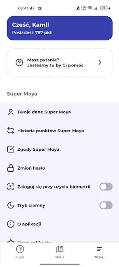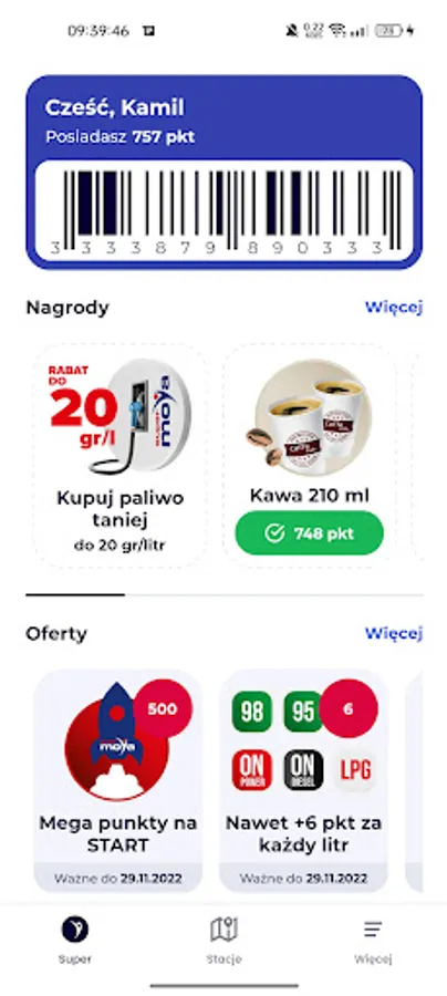 Thanks to the Super MOYA application, you can collect points, view dedicated promotional offers, check your account history and navigate to the selected MOYA station. The registration process in the application is simple and intuitive. All you have to do is scan the Super MOYA card available in the mobile application with each purchase and your account will increase by additional points. Once you collect the right number of points, you can exchange them for attractive fuel discounts and discounts on products available at our stations. Download the app today and register in a few simple steps. Enjoy cheaper fuel thanks to the Super MOYA application.
