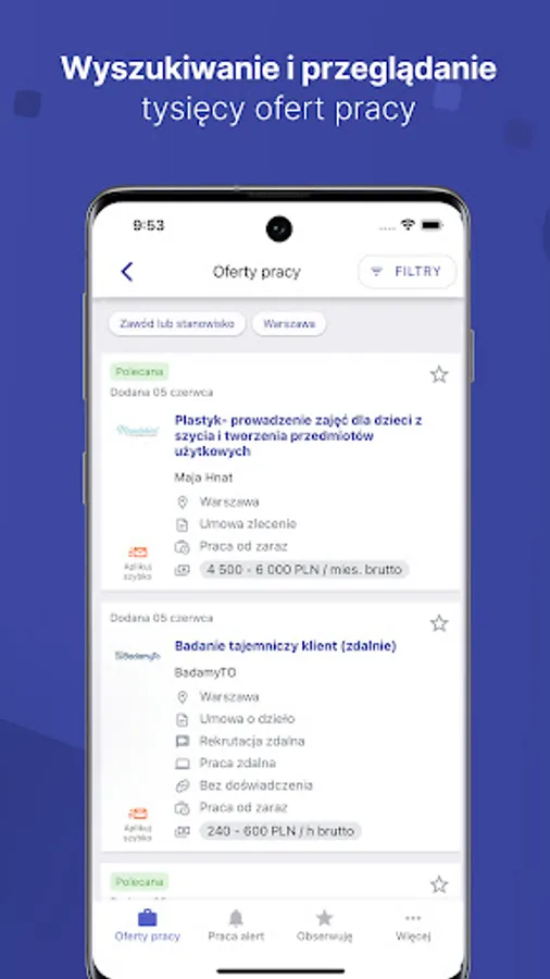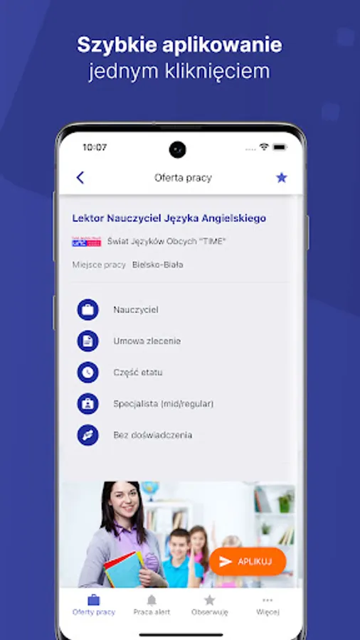 With Appluj.pl you have access to current job offers from employers in every industry and you can apply quickly from your phone. Thanks to notifications, you are always up-to-date to be able to react quickly to new job offers.
