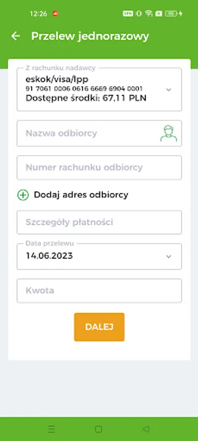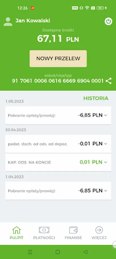 - Settlement account - immediately after logging in to the application, you will receive information about the amount of funds available on the settlement account, you will get acquainted with the history of operations on the account and quickly make a new transfer.